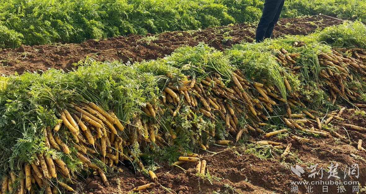“黃玉”胡蘿卜的豐收和暢銷,得益于鄉(xiāng)賢的引領(lǐng)和帶動(dòng)。應(yīng)城市城中街道周陳村沿富水河而居,耕地面積1217畝,以“黃玉”胡蘿卜種植為主。周陳村大多的村民過去以碎片化種植蘿卜、白菜等蔬菜為主,只能靠自己拖去農(nóng)貿(mào)市場擺攤銷售,經(jīng)常出現(xiàn)滯銷的情況,辛苦種植的蔬菜只能爛在地里,靠種菜而生的村民生活更加困難。