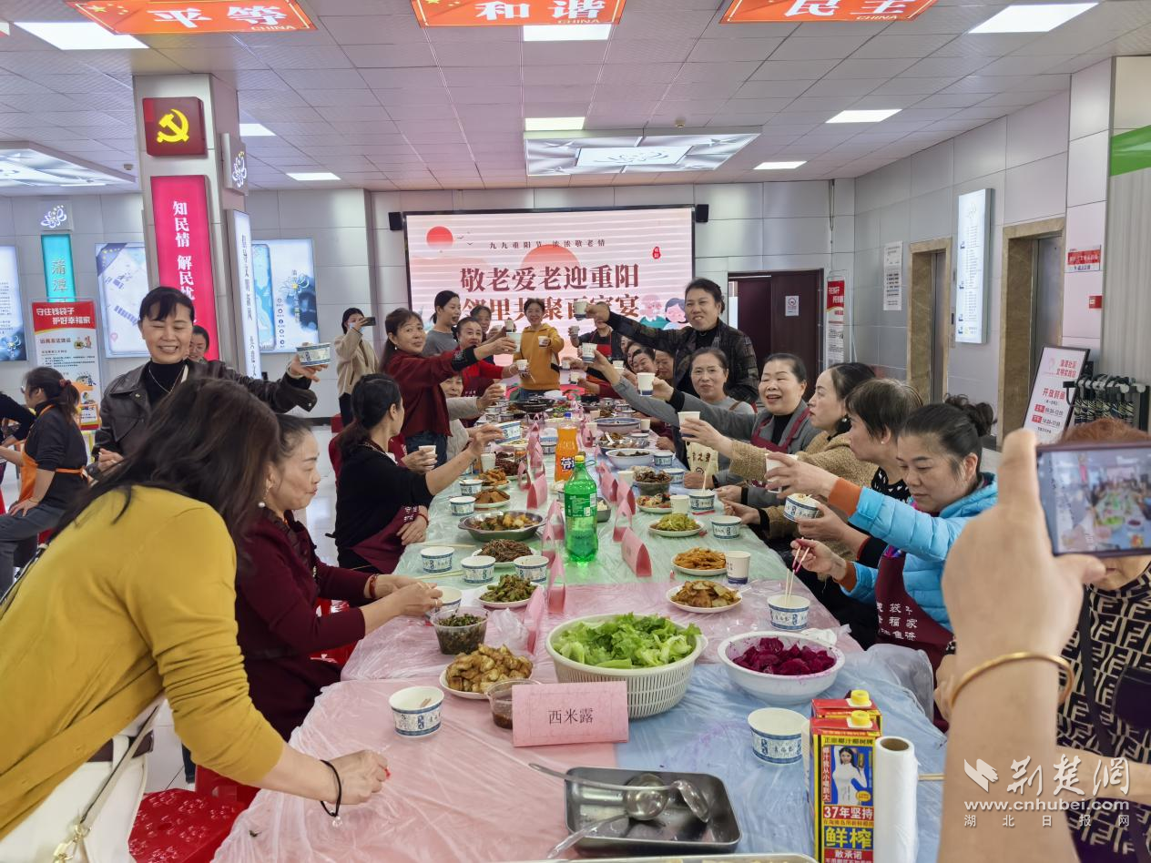 當(dāng)天上午,蒲潭社區(qū)老年學(xué)校與居家養(yǎng)老服務(wù)中心以“敬老愛(ài)老迎重陽(yáng),鄰里共聚百家宴”為主題,舉辦了一場(chǎng)熱鬧的重陽(yáng)百家宴活動(dòng)。為廣大老年居民送上第一份“暖心禮”。社區(qū)居民歡聚一堂,煮餃子、炸雞冠餃,品佳肴、唱?dú)g歌,共慶佳節(jié)。