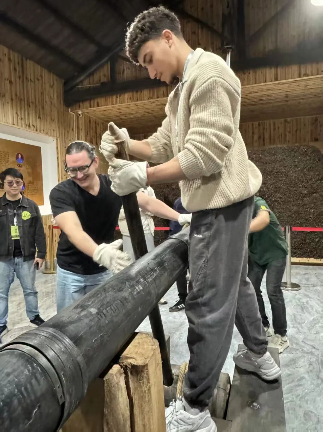 留學(xué)生在中國青磚茶非遺技藝傳承館體驗(yàn)壓制青磚茶。