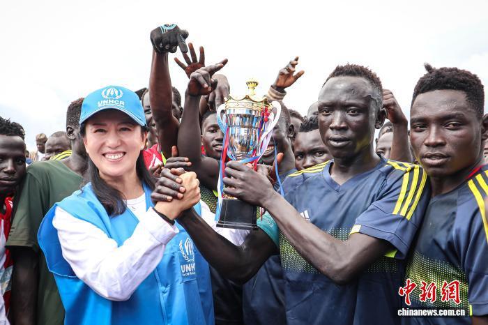 當地時間2025年9月23日,聯合國難民署親善大使楊揚訪問位于埃塞俄比亞的班巴西難民營,與難民及當地社區(qū)足球友誼賽獲勝團隊共同舉起獎杯。(聯合國難民署供圖)