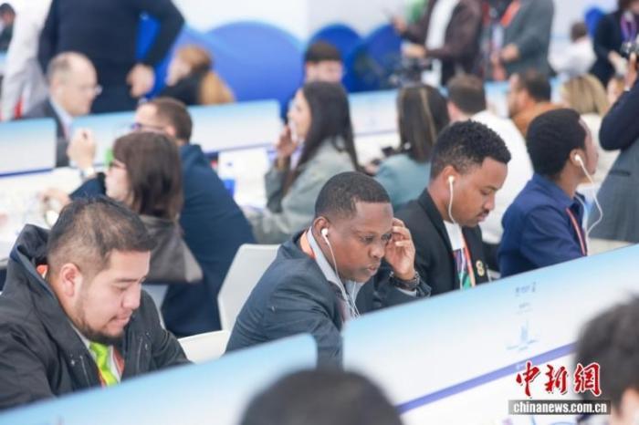 11月5日,第八屆中國國際進(jìn)口博覽會(huì)暨虹橋國際經(jīng)濟(jì)論壇開幕式在國家會(huì)展中心(上海)舉行。圖為外國媒體記者在新聞中心收聽開幕式上的嘉賓發(fā)言。中新社記者 賈天勇 攝