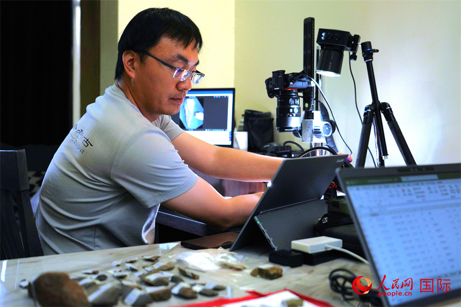 中方隊(duì)員彭勝藍(lán)對(duì)2025年調(diào)查石制品進(jìn)行測(cè)量統(tǒng)計(jì)。人民網(wǎng)記者 黃煒鑫攝