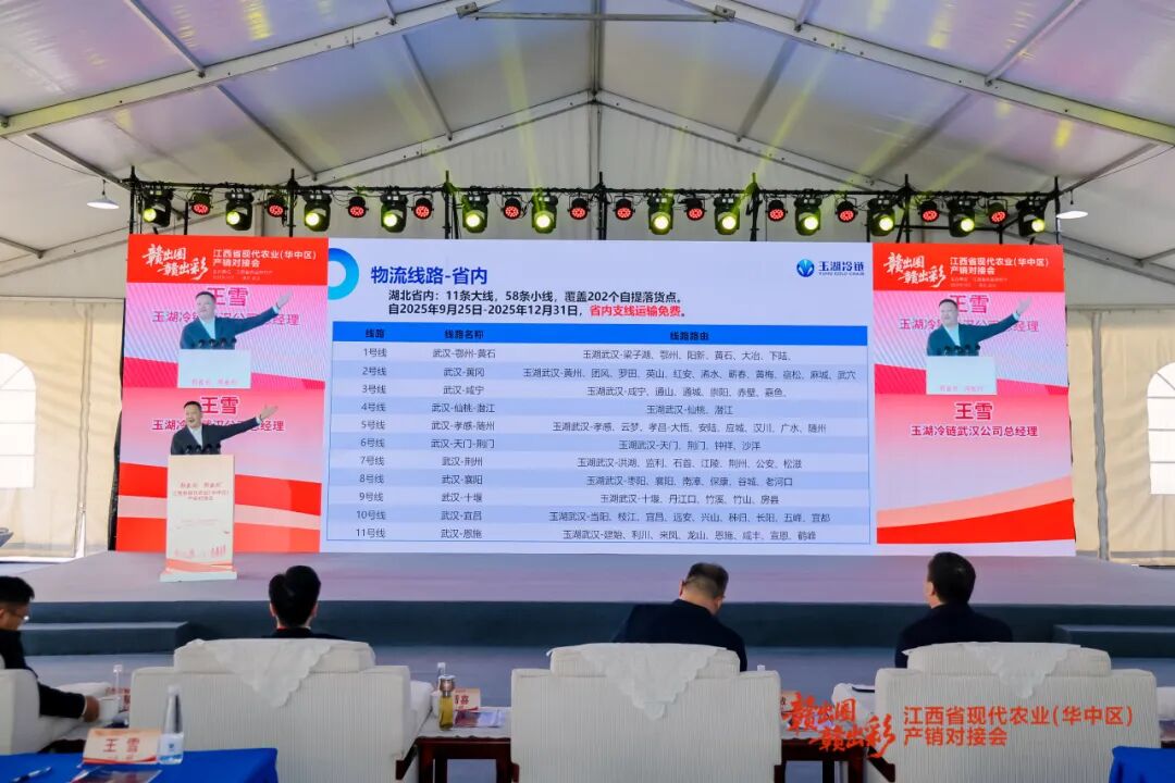 對(duì)接會(huì)當(dāng)天,玉湖冷鏈武漢公司負(fù)責(zé)人介紹了依托黃陂基地構(gòu)建的綜合服務(wù)體系及專項(xiàng)物流優(yōu)惠政策。該體系以“降本增效”為核心,為贛鄂兩地食材流通提供從產(chǎn)地倉(cāng)儲(chǔ)、干線運(yùn)輸?shù)浇K端配送的一體化解決方案,助力江西企業(yè)實(shí)現(xiàn)“產(chǎn)地直供+華中直銷”的暢通循環(huán)。