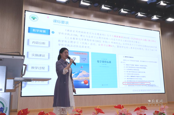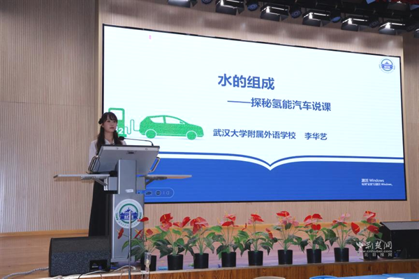 武漢大學(xué)附屬外語學(xué)校李華藝?yán)蠋焾?zhí)教《水的組成——探秘氫能汽車》展示課。課程以新能源汽車為線索,設(shè)計(jì)四大項(xiàng)目,學(xué)生通過海報(bào)、角色扮演等形式展示探究成果。李老師引導(dǎo)學(xué)生從宏觀、微觀、符號(hào)三重視角認(rèn)識(shí)水的組成,最終用電解產(chǎn)生的氫能讓小車現(xiàn)場行駛,實(shí)現(xiàn)化學(xué)與科技的有機(jī)融合。說課環(huán)節(jié)中,她介紹項(xiàng)目圍繞“氫能汽車如何工作”展開,借助AI模擬生產(chǎn)過程,讓學(xué)生感受化學(xué)的實(shí)踐價(jià)值。
