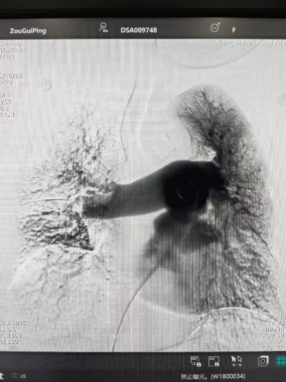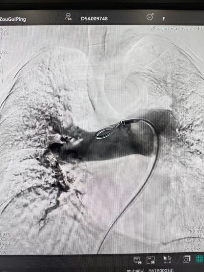 手術(shù)在局部麻醉下進行,團隊通過股靜脈穿刺,將專用抽栓導管精準送達肺動脈栓塞部位,利用負壓抽吸技術(shù)成功清除大量血栓;隨后,在血栓局部精準灌注溶栓藥物,進一步溶解殘余血栓,恢復肺部血流灌注;同時,為防止下肢深靜脈血栓再次脫落引發(fā)肺栓塞,團隊為患者置入下腔靜脈濾器,整個手術(shù)歷時約1小時。術(shù)后,鄒婆婆呼吸困難癥狀即刻得到緩解,血氧飽和度顯著提升,右心負荷明顯減輕,目前身體狀況正在逐步恢復中。