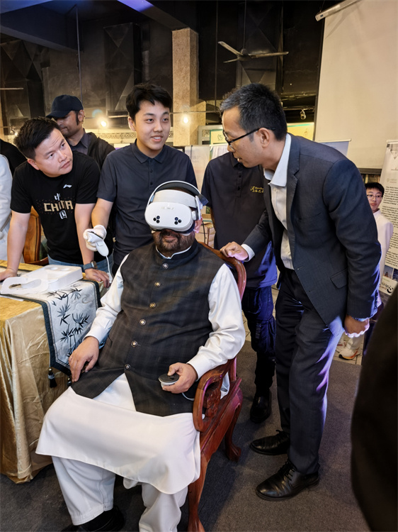 11月7日晚,巴基斯坦國家遺產(chǎn)與文化部部長奧朗則布在中國旅游文化周活動展區(qū)體驗(yàn)VR設(shè)備。中國駐巴基斯坦使館供圖