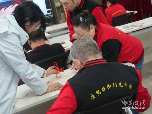 在中國結編織互動中,志愿者手把手教學員編織寓意吉祥的中國結。編織過程既鍛煉了手部協(xié)調能力,又通過互幫互助增進了彼此情誼,現(xiàn)場充滿歡聲笑語?;顒游猜暎嗄曛驹刚邽槊课粚W員送上自己親手制作的中國結,傳遞美好祝福。