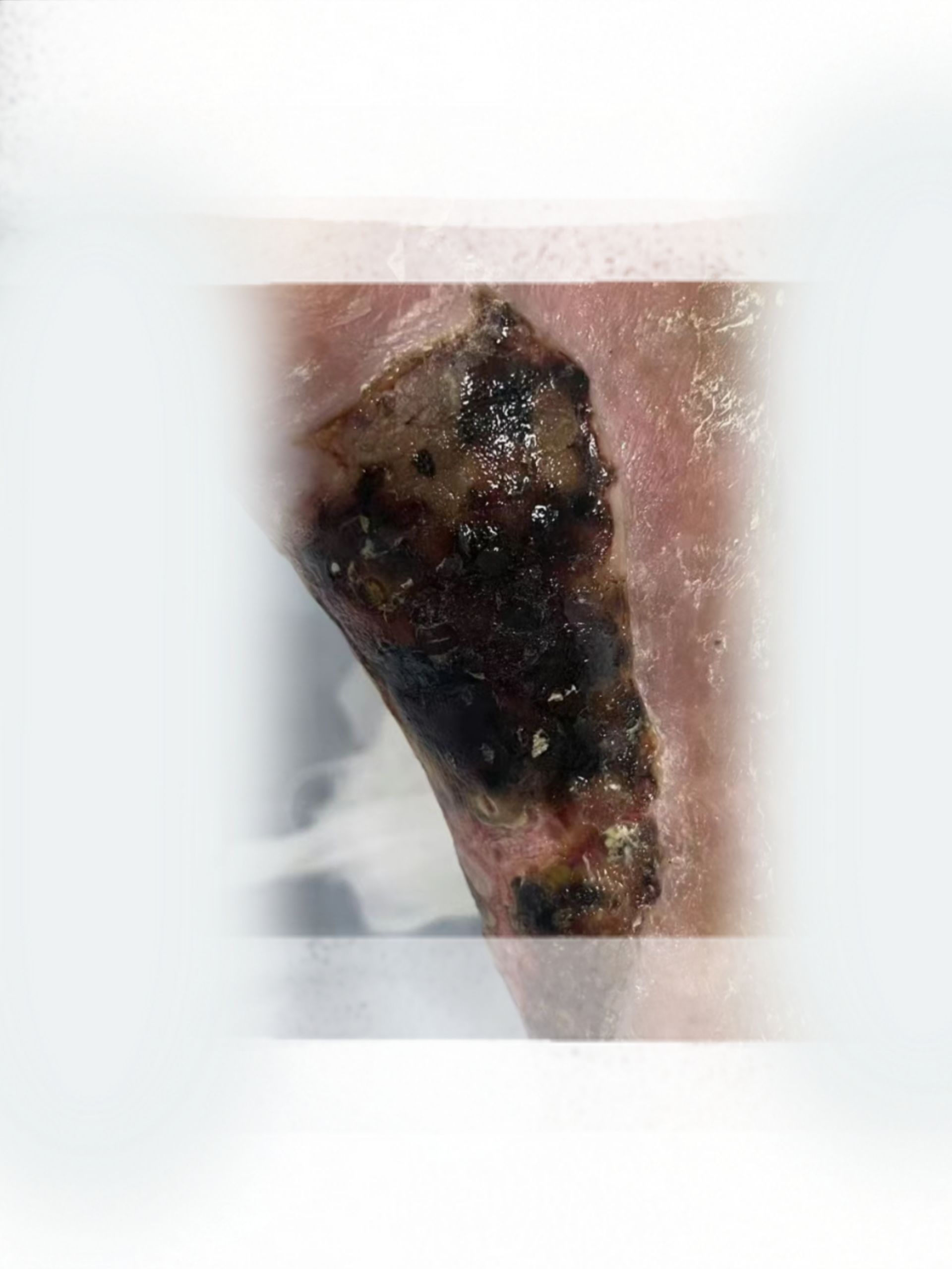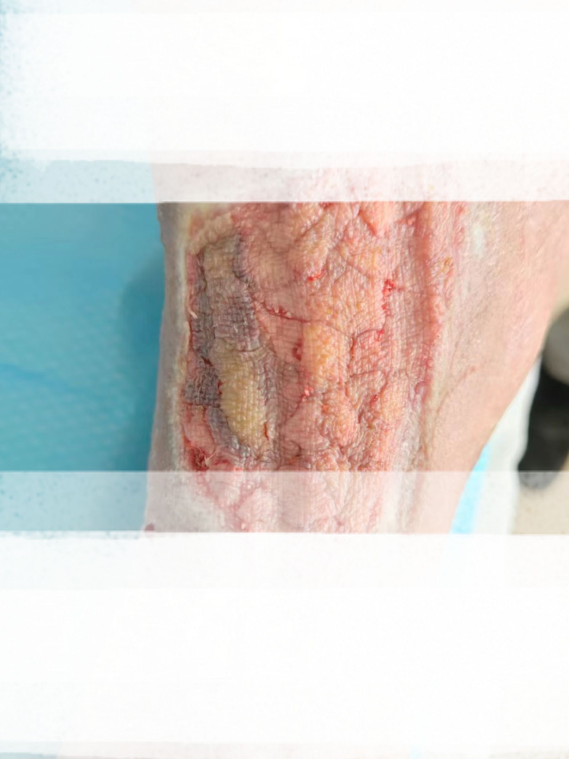 時(shí)間回到三周前,一場(chǎng)車禍讓程大爺?shù)挠蚁轮馐苤貏?chuàng)。在當(dāng)?shù)啬橙?jí)醫(yī)院接受多次清創(chuàng)術(shù)及負(fù)壓封閉引流(VSD)治療后,創(chuàng)面不僅未愈合,反而持續(xù)惡化——右小腿傷口潰爛流膿,皮膚呈黑褐色壞死狀,感染不斷加重。隨著病情進(jìn)展,程大爺身形日漸消瘦,血壓控制不佳,家人焦急萬分,帶著最后一絲希望轉(zhuǎn)診至孝感市中心醫(yī)院急診外科。