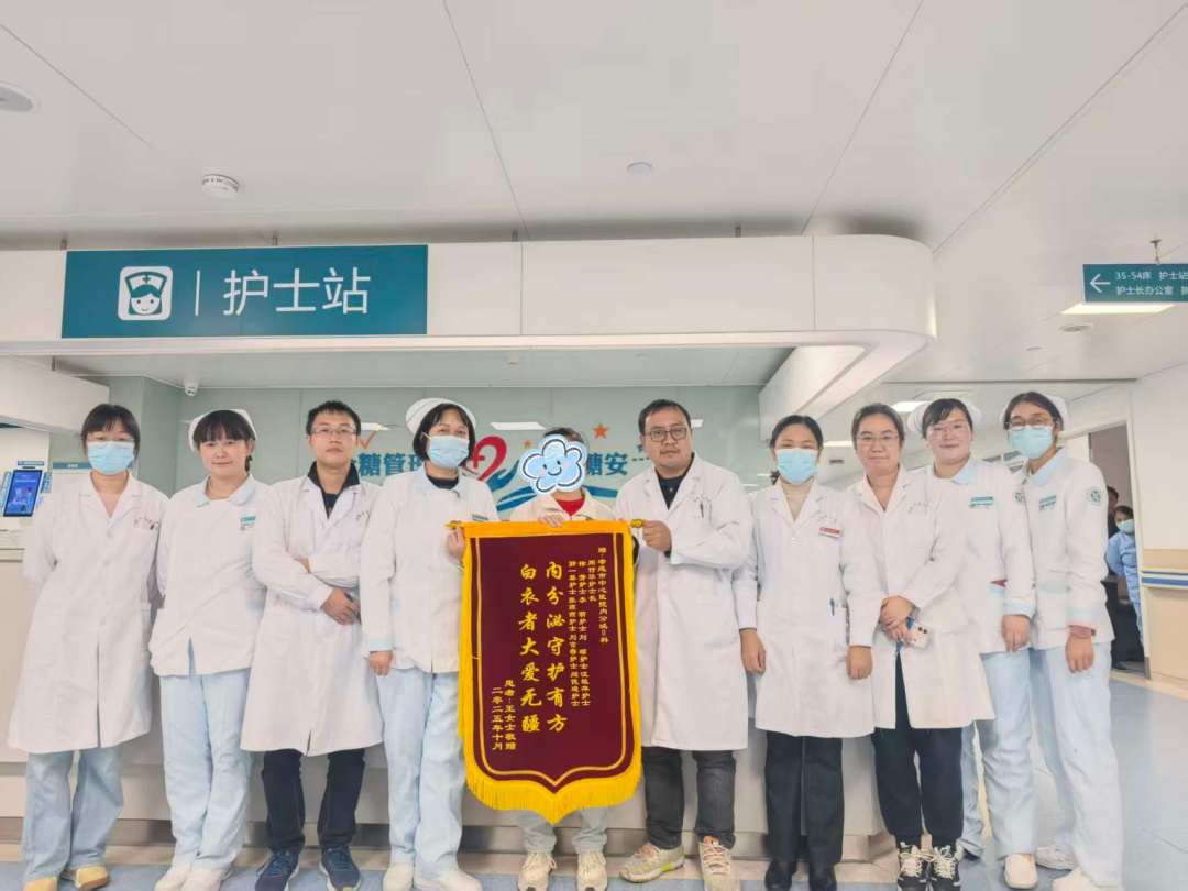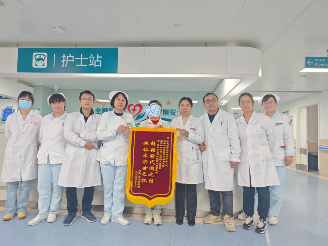 荊楚網(wǎng)(湖北日報(bào)網(wǎng))訊(通訊員 周付華)“內(nèi)分泌守護(hù)有方,白衣者大愛無疆”“解糖脂代謝之困,施仁術(shù)濟(jì)世之懷”。近日,孝感市中心醫(yī)院內(nèi)分泌科II病區(qū)收到兩面紅底金字的錦旗。剛康復(fù)出院的王阿姨(化名)專程送來這份感謝,錦旗上的字跡,既是患者的真誠贊譽(yù),也記錄了一場救治糖尿病重癥并發(fā)癥患者的攻堅(jiān)過程。